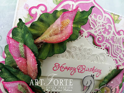 Now stamp a few Calla Lily flowers and leaves using archival ink- leaf green for flowers and Library green for leaves, cut them with coordinating die and color them with Vivid Chartreuse and sunflower on both sides. For the leaves, color them with leaf green on both sides and shape them using Calla Lily 3D Shaping Mold and for flowers twirl them as pictured and then add stamen and diamond dust. For Leaves color them with archival ink-library green on the edges of leaves.