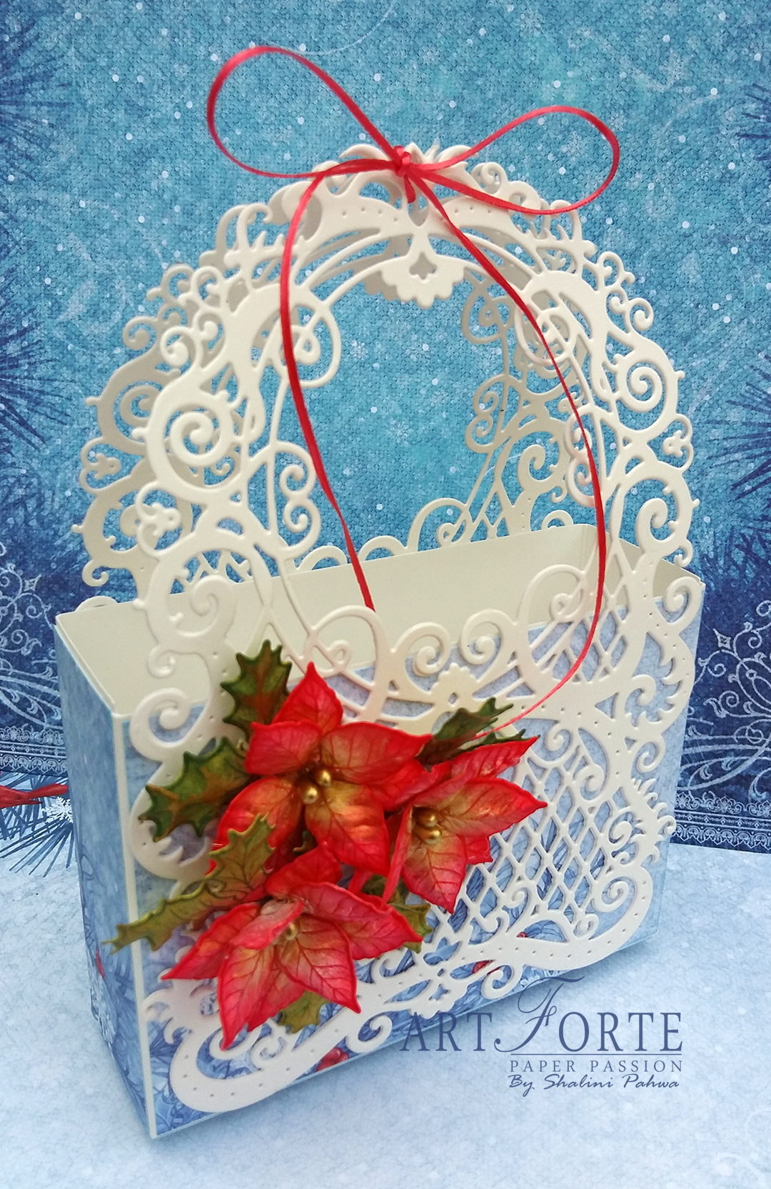 Instructions: Take two white cardstock size 5” x 7.75”. Score at 1.5” and on the longer side score at 1.5”, 6.25”. Cut tabs by cutting up to the horizontal scored line on the long edge. Apply glue to both short edge and long edge. Overlap the flaps on both long edges. Fold the score edges and basket is ready. Now adhere pattern paper from Festive Winterscapes Paper Collection HCDP – 2118 on all four sides. Cut two Lattice Swirl Gateway Die HCD2-7328 on white cardstock and adhere on the basket using Designer Dries Clear Adhesive. Add ribbon on the top attaching both the dies creating handle.