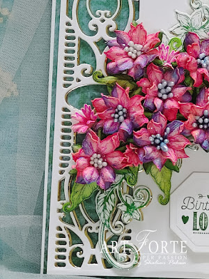 Stamp some small flowers from Rectangular Floral Frame Cling Stamp Set HCPC-3974, using archival ink-vibrant fuchsia and cut them with coordinating die, color them using carnation red and add prills. Add to composition.