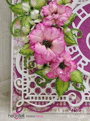 Stamp some leaves from HCPC-3958 Small Festive Poinsettia Cling Stamp Set using archival ink- periwrinkle, cut it with coordinating die. Color them using archival ink-golden rod. Arrange poinsettia flower and leaves as seen on picture.